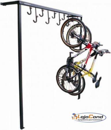 possui ganchos com roldanas que prendem as bicicletas pela roda. Cada gancho conta com um porta cadeado, garantindo a segurança dos veículos.